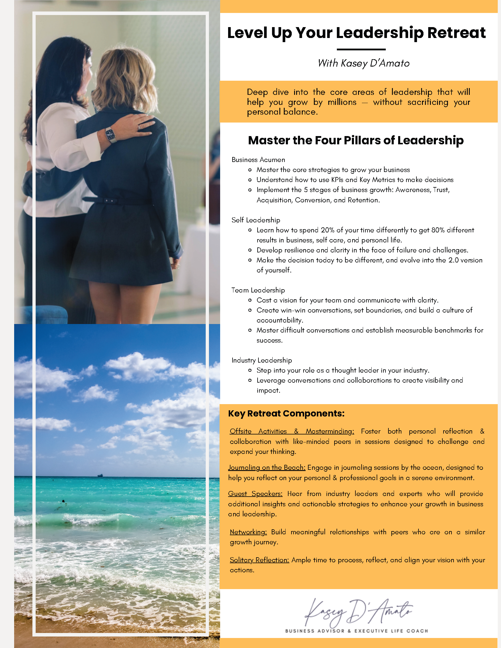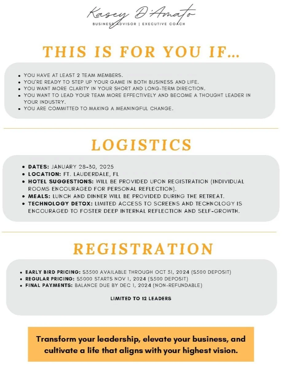 DISCLAIMER: Your attendance and travel to this retreat are “at your own risk,” and by registering for this retreat you agree to hold harmless Kasey D’Amato and its business affiliates from any and all experiences, outcomes or actions you encounter as a result of attending this retreat. Outcomes and results are not guaranteed, and vary from person to person. By attending this retreat, you release Kasey D’Amato and its business affiliates from any and all liability associated with any aspect related to your attendance of this retreat. There will be photographs and video taken during this retreat, and you release all rights to the use of any photographs and video that contains you or your likeness to Kasey D’Amato, and agree to its use for any educational, marketing, sales, promotion, or any use deemed appropriate by Kasey D’Amato. All educational materials, concepts, discussions, topics, teachings, lessons, and all aspects related to this retreat are the intellectual property of Kasey D’Amato and its affiliates, and shall not be duplicated or shared without prior written consent.